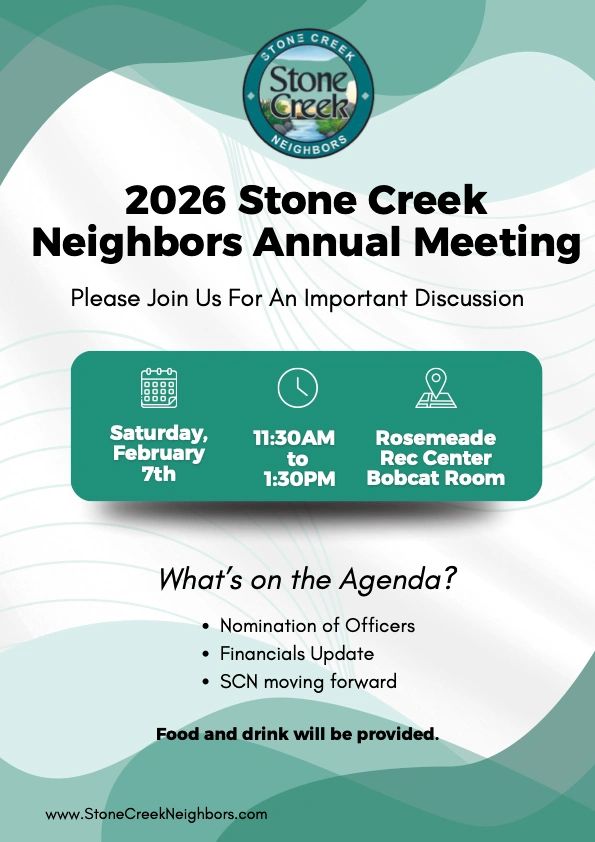The mission of Stone Creek Neighbors is to promote the general welfare, happiness and civic pride of the real property owners and residents in Stone Creek Estates, located in Carrollton, Texas. Membership is strictly voluntary, and open to any property owner in Stone Creek Estates. Members shall be considered in good standing if all membership dues are current. For information on how to join the association, please click here: